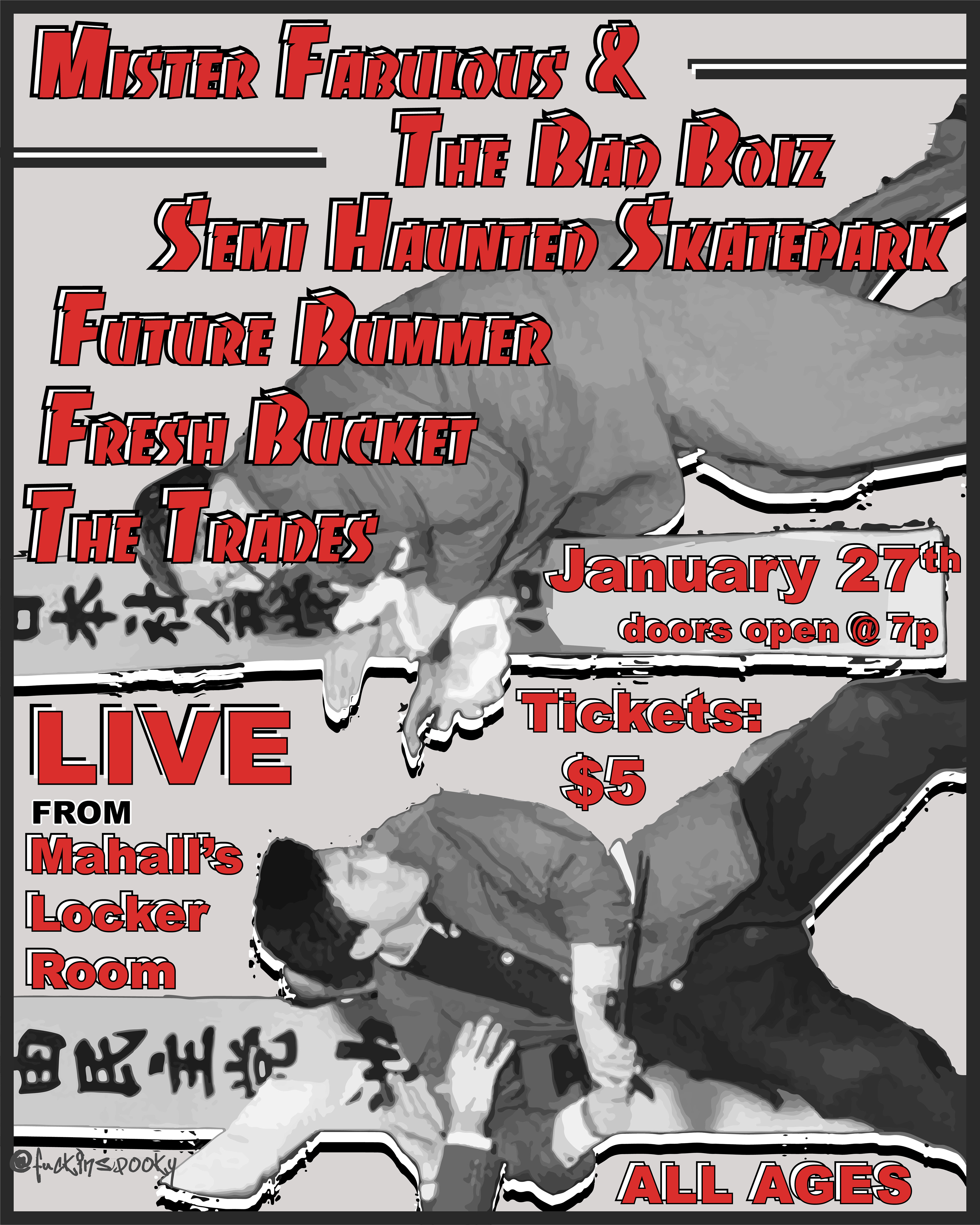 Show poster for Mister Fabulous & The Bad Boiz, Semi Haunted Skate Park, Future Bummer, Fresh Bucket, and The Trades. E2018